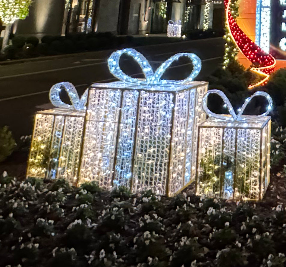 Our illuminated gift boxes are the perfect addition to your holiday decor. These gift boxes are made for commercial indoor or outdoor Christmas or holiday displays with a durable aluminum framing and silicon mesh webbing. The large gift boxes are then lit with LED mini lights, shown in warm white with cool white accents.
